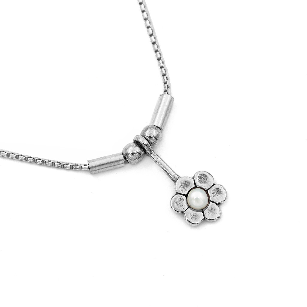 A virág medál teljes hossza 14 mm, a virág 8 mm átmérőjű, a közepén lévő gyöngy 3 mm átmérőjű. Az ezüst gömbök 3 mm átmérőjűek, az ezüst hengerek mérete 5 x 2 mm. A lánc 0,9 mm átmérőjű.